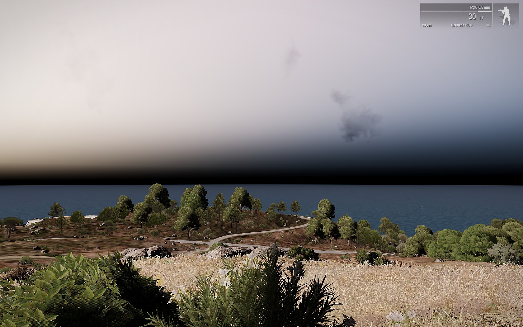 Ils nous ont fait quoi là? Horizon noir, ciel jaune style hiver nucléaire, crénelages sur la végétation, et le dessous des bois sombre comme dans le fond d'une grotte. MMMeurk!!! Il n'y a que l'eau qui est chouette. Mise à jour dégeue!!!! . Sans rire, on va retourner jouer à ARMA 2!